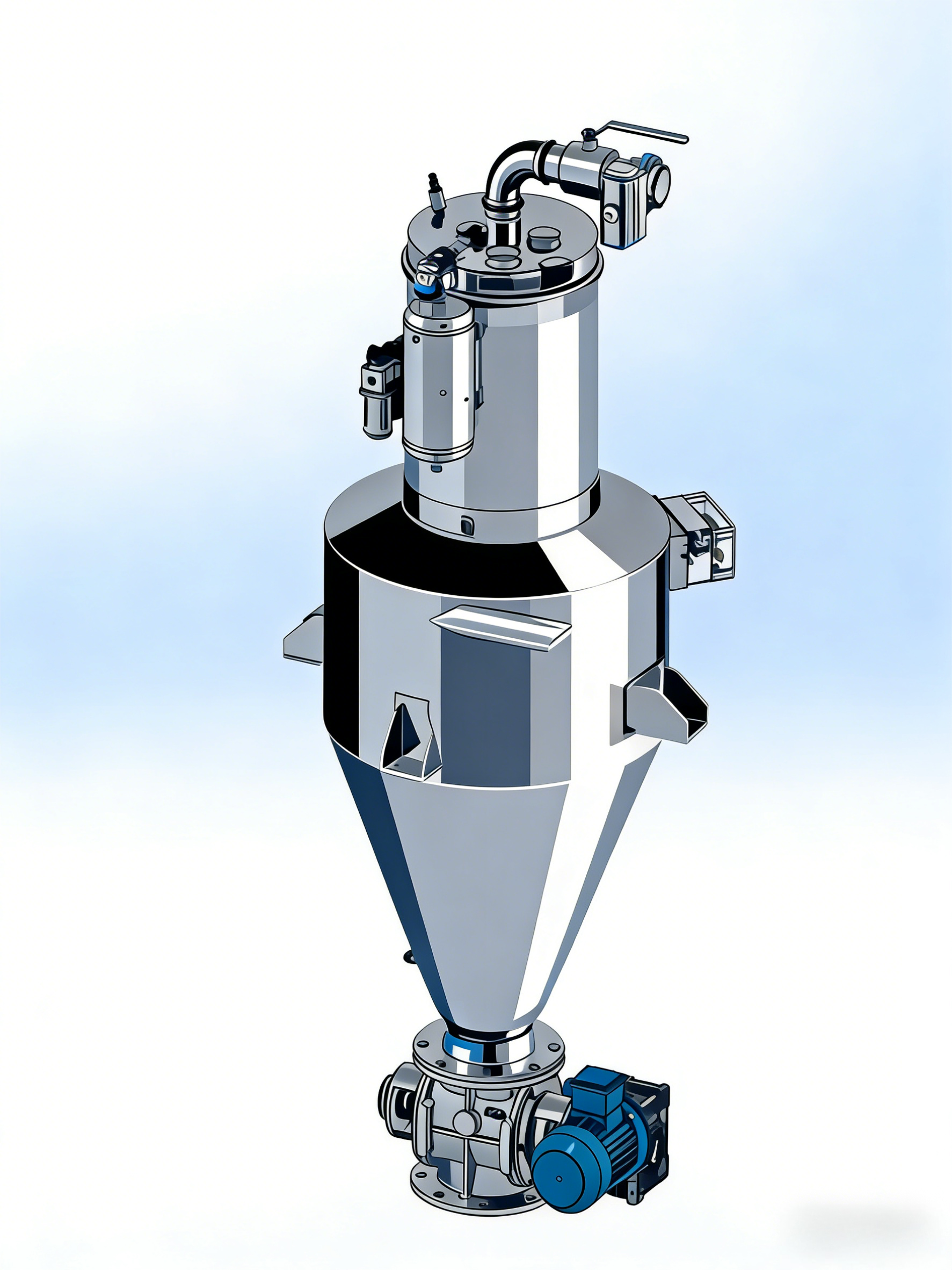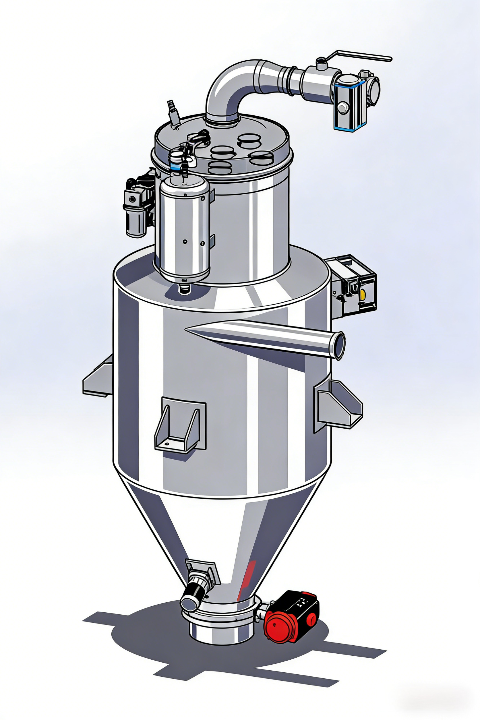 真空上料机是整个输送系统的核心调控枢纽,负责实现气固分离、物料卸料与输送参数的精准调控。其工作原理是通过接收控制系统信号,协调罗茨风机产生负压,将物料从进料单元吸入输送管道,进入分离料斗后,通过PTFE覆膜滤芯(过滤精度0.2-5μm)实现气固分离,过滤后的洁净空气排出,物料则通过卸料阀落入目标设备,完成一次输送循环。